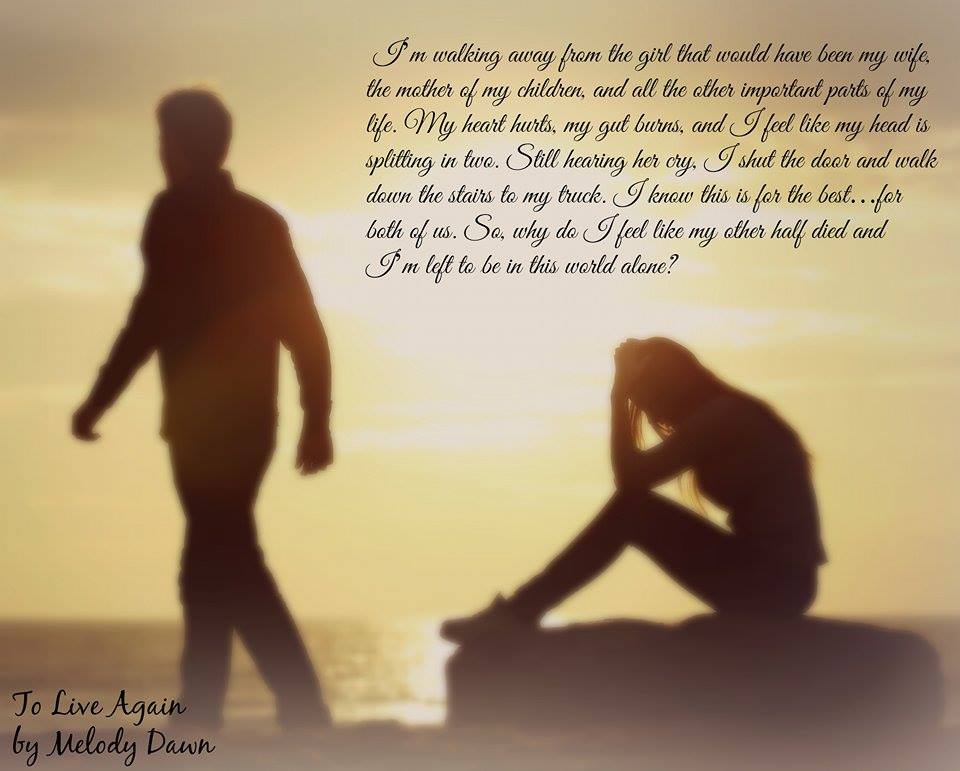 More and more tears fall from her beautiful eyes and I know if I don’t get out of there, I’m going to cave in. I turn away from her, walk to the door and open it, knowing I’m walking away from the girl that would have been my wife, the mother of my children, and all the other important parts of my life. My heart hurts, my gut burns, and I feel like my head is splitting in two. Still hearing her cry, I shut the door and walk down the stairs to my truck. I know this is for the best…for both of us. So, why do I feel like my other half died and I’m left to be in this world alone?