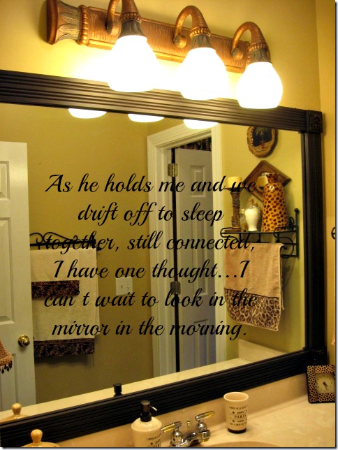 As I start to move around, I feel sore, sticky, but extremely blissful. I probably should have cleaned up afterwards, but sex coma, remember? Realizing that I need to go to the restroom like last year, I try to get out of bed without waking him. Once I’m up and moving, I see the clock…its 4:12 AM…I think my cheeks are about to crack from grinning because it doesn’t say 5:48. That has to be some sort of progress and closure. All I can think of is soon as I’m done…I’m looking in his mirror!